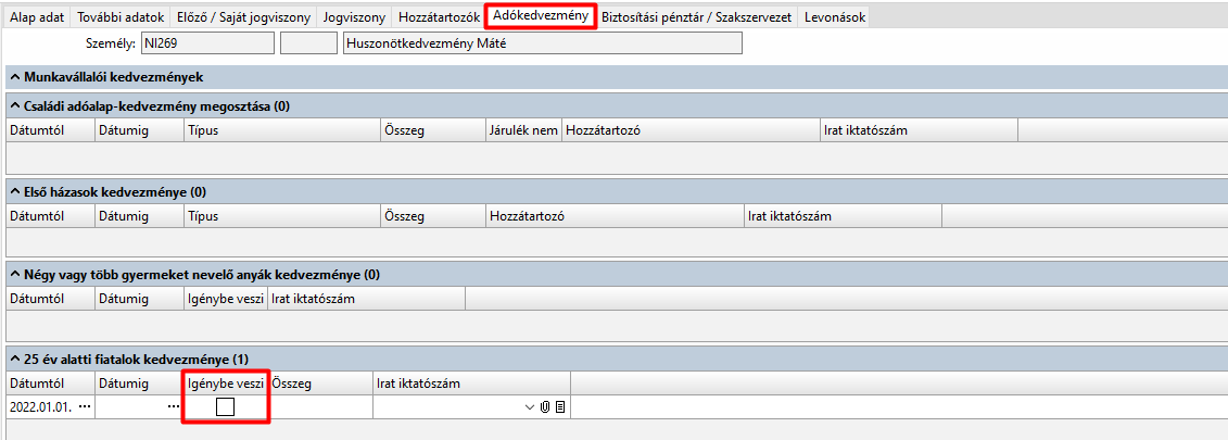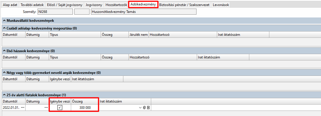 A kedvezmény érvényesítése a jogszabály alapján összefügg az Első házasok kedvezményének érvényesítésével. Kérjük, amennyiben a 25 év alatti fiatal dolgozó jogosult lenne mind a két kedvezményre, akkor a jogszabályban leírtak szerint állítsák be / módosítsák az Első házasok kedvezményét. Ez utóbbi kedvezményt a program a beállítástól függően számolja, magát a tényleges jogosultságot nem vizsgálja.