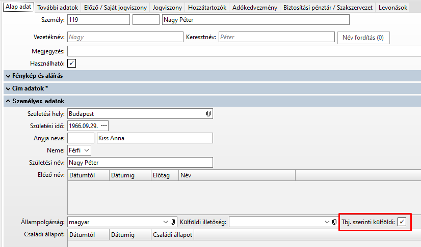 Ahhoz, hogy a program a 364-368. sorok kitöltése mellett X-et tegyen a jelölő négyzetbe, a Személy funkcióban szükséges jelölni, hogy a személy Tbj. szerinti külföldi-e: