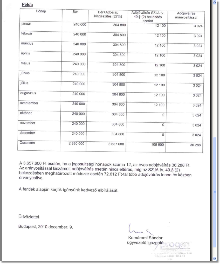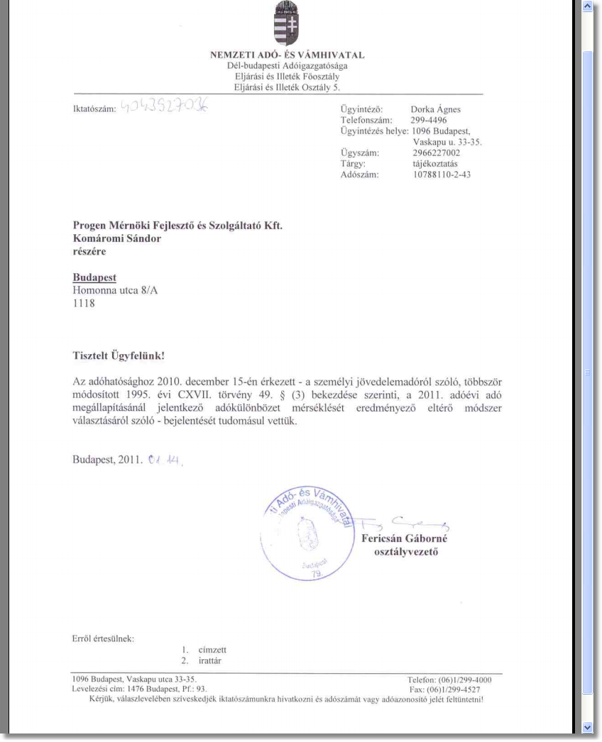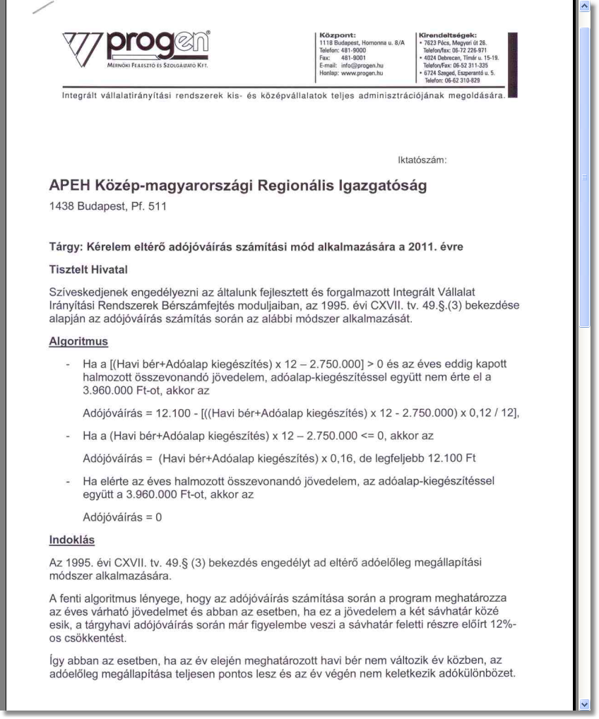 A ProgEn Kft. 2011-re szóló APEH engedélye az optimalizált SZJA számítási móddal kapcsolatban: