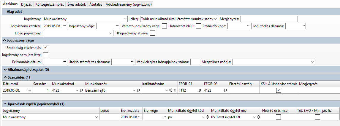 A Jogviszony jellegénél van lehetőség a "Több munkáltató által létesített munkaviszony" kiválasztásával jelölni, melynek hatására a 'T1041-es bevallásba a megfelelő, 1112-es jogviszonykóddal kerül átadásra a személy. A bevallásban a további foglalkoztatók adtainak átadásához a Személy / Jogviszony / Általános fülön az ügyfél törzsből lehet kiválasztani az Igazolás egyéb jogviszonyból résznél a munkáltatókat.