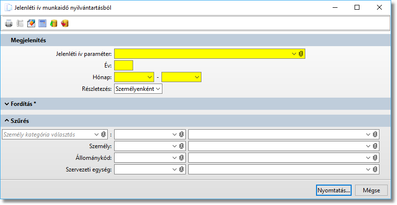 Funkció elérése menüszerkesztéskor: Bérszámfejtés / Listák havonta / Jelenléti ív munkaidő nyilvántartásból