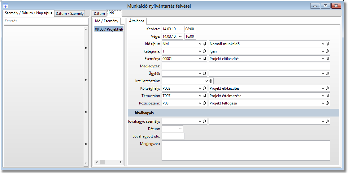 A funkció a munkaidők nyilvántartására szolgál. A munkaidőkhöz rendelhetünk eseményt, ügyfelet, költséghelyet, témaszámot, pozíciószámot. A nyilvántartást excelbe exportálhatjuk, ahol szűrésekkel tudjuk elemezni a munkaidő eltöltését. Később a nyilvántartás adataiból a számfejtés előkészítésekor ajánlott naptárban is megjelennek az itt rögzített munkaidő adatok.