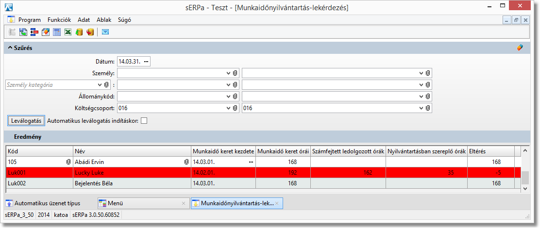 Funkció elérése menüszerkesztéskor: Bérszámfejtés / Munkaidőnyilvántartás-lekérdezés