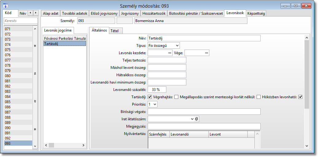 A típust, a levonanadó százalékot és a tartásdíj logikai mezőt kell beállítani. A tartásdíat a program mindíg az első és legfonotsabb levonásként veszi figyelembe.