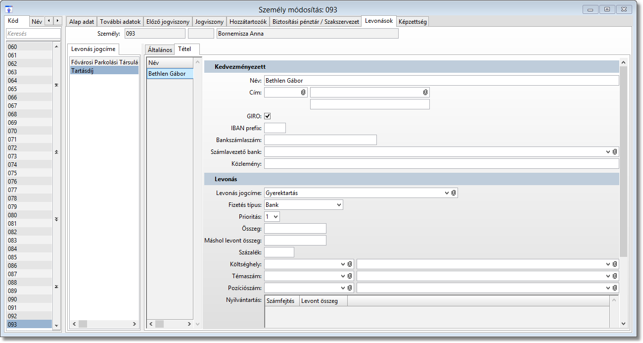 A tétel fülön a kedvezményezett adatait kell megadni(az átutalási megbízás figyelembe veszi) és a levonás jogcímét kell beállítani.