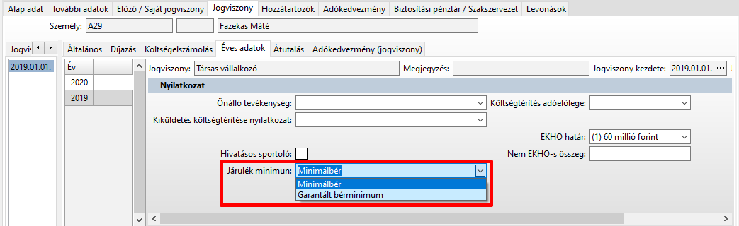 Ennek beállítására a Jogviszony / Éves adatoknál van lehetőség.