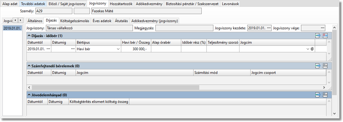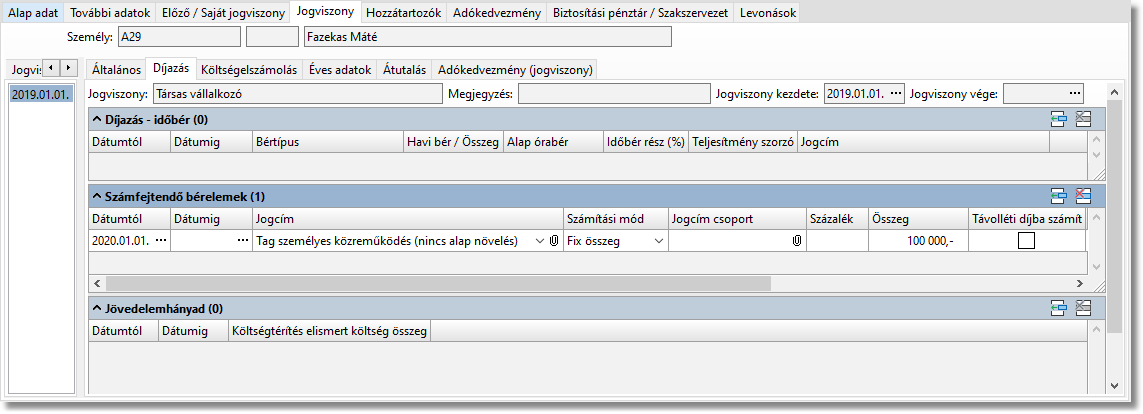 A Jogviszony / Díjazás fülön adhatjuk meg a tagi kivét összegét.