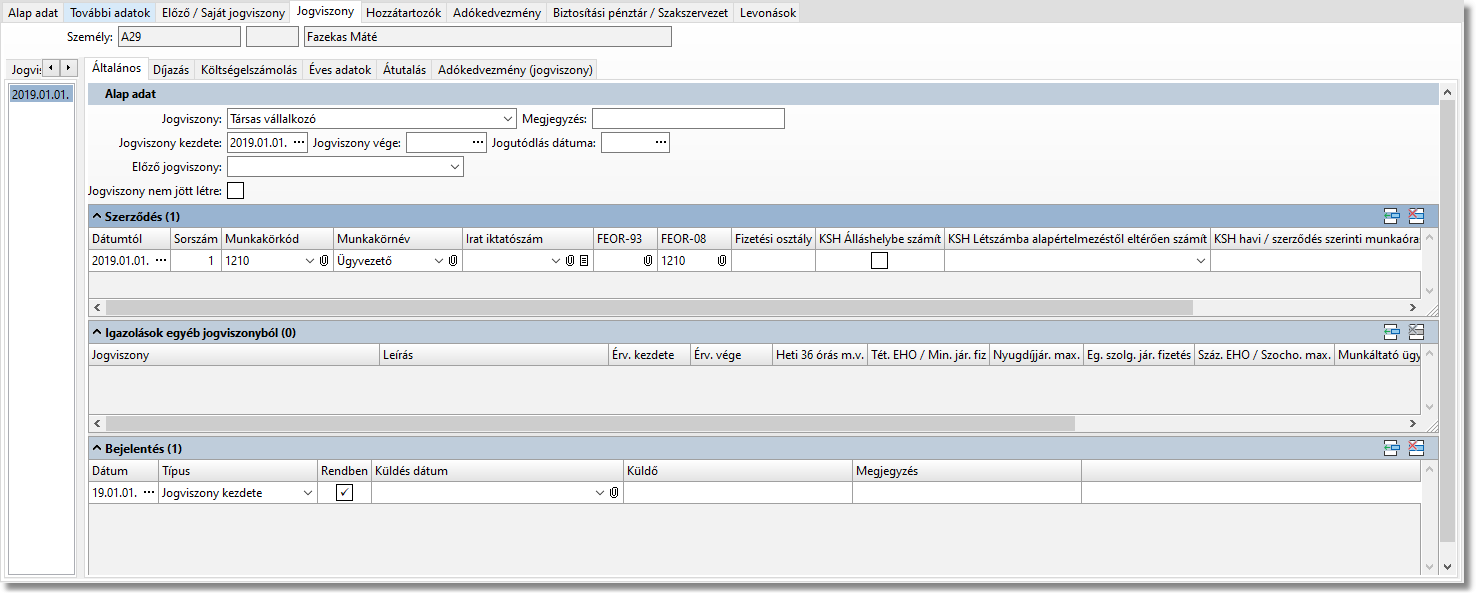 A jogviszony típusát és a jogviszony kezdeti dátumot, ahogy minden jogviszony esetén, kötelező megadni.