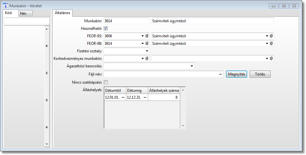 A funkcióval meghatározott - FEOR számmal és munkaszerződés mintával ellátott - munkakörökre a jogviszony megadásánál kell hivatkozni a személytörzsben. Az ily módon a jogviszonyhoz rendelt FEOR számot a program a munkaügyi statisztika elkészítésénél használja.