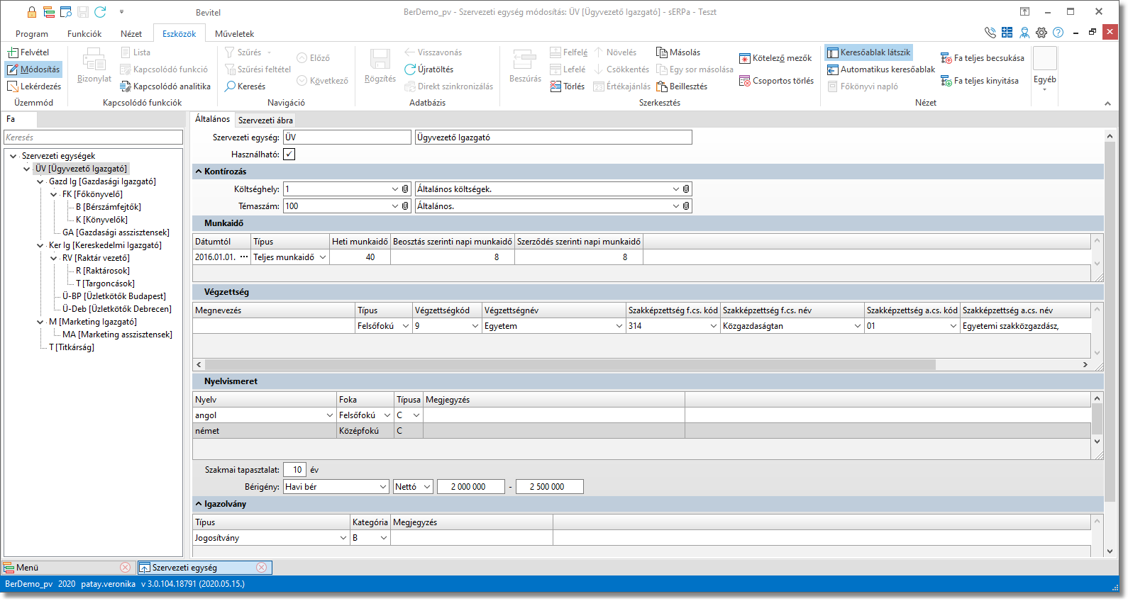 Funkció elérése menüszerkesztéskor: Bérszámfejtés / Struktúra beállítások / Szervezeti egység