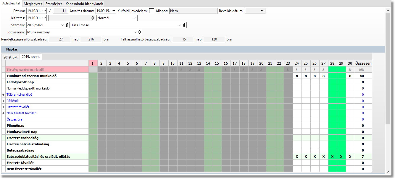 •Hóvégi (naptáras) számfejtés esetén a már meglévő számfejtés napjait felülírja azzal, ami a pénzbeli ellátásból következik (táppénz, gyáp, csed, gyed jelölés), és összekapcsolja a számfejtést és a pénzbeli ellátás(oka)t.