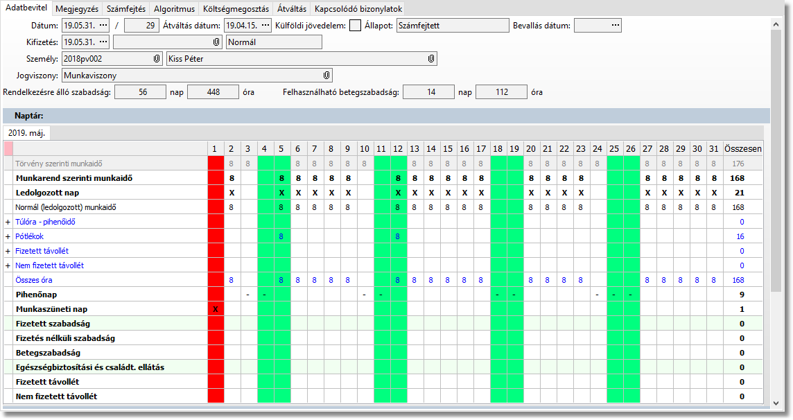 Az Adatbevitel fülön a költségrészletezés táblában ha a Ledolgozott idő típus van megadva, akkor nem szabad több órát megadni mint az ehhez az idő típushoz tartozó órák (és ezek csak a rendes munkaidőn felüli idők lehetnek), a jelenléti ív kódot tartalmazó sorokban szereplők pedig nem lehetnek több mint a munkarend szerinti munkaidő.