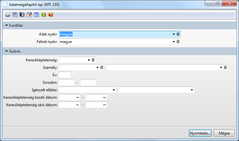 Funkció elérése menüszerkesztéskor: Bérszámfejtés / TB kifizetőhely / Listák / Adatmegállapító lap (KPE 230)