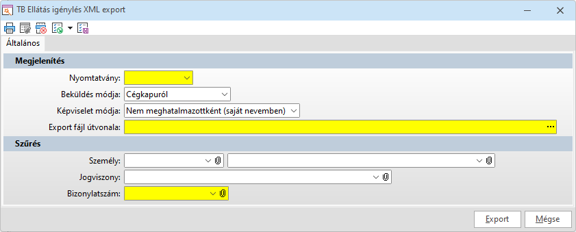 Funkció elérése menüszerkesztéskor: Bérszámfejtés / Keresőképtelenség / EB_IGBEJ_01 űrlap XML export