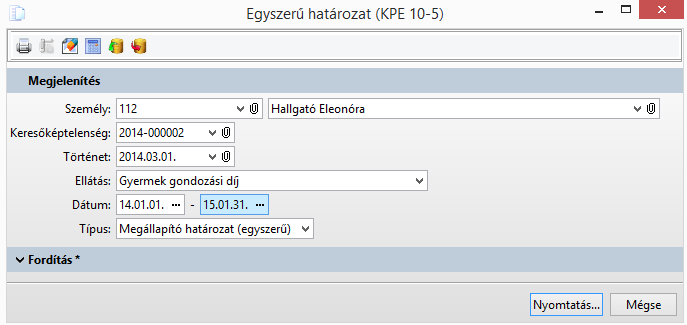 Funkció elérése menüszerkesztéskor: Bérszámfejtés / TB kifizetőhely / Listák / Egyszerű határozat