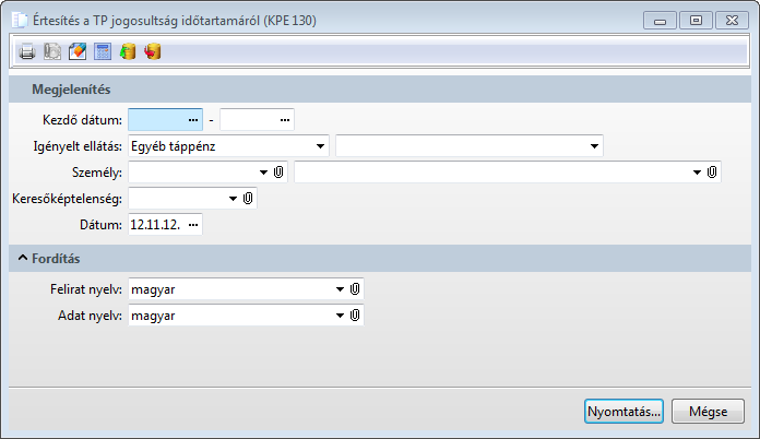 Értesítés a TP jogosultság időtartamáról (KPE 130) - Párbeszédablak -