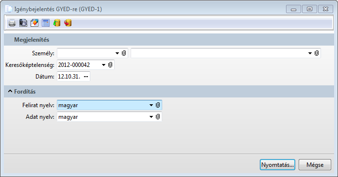 A listával az Igénybejelentés GYED-re (GYED-01) nyomtatványt nyomtathatjuk.