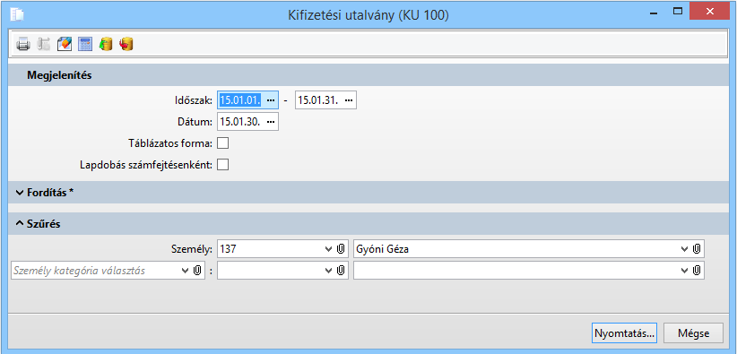 Funkció elérése menüszerkesztéskor: Bérszámfejtés / TB kifizetőhely / Listák / Kifizetési utalvány (KU 100)