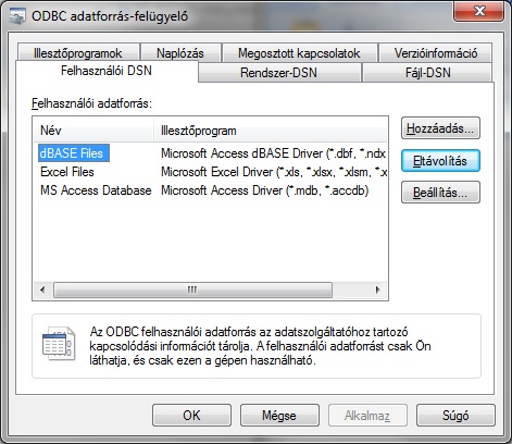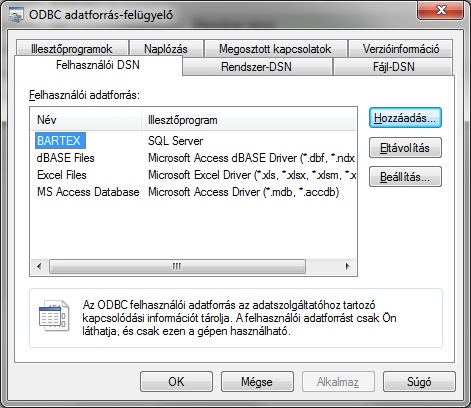 Ekkor az ODBC adatforrás-felügyelőben megjelenik a megadott nevű adatforrás.