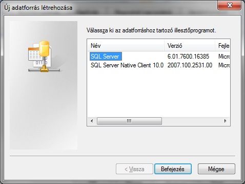A megjelenő új adatforrás ablakban ki kell választani az adatforráshoz tartozó illesztőprogramot. (PL: SQL server) Meg kell nyomni a befejezés gombot.