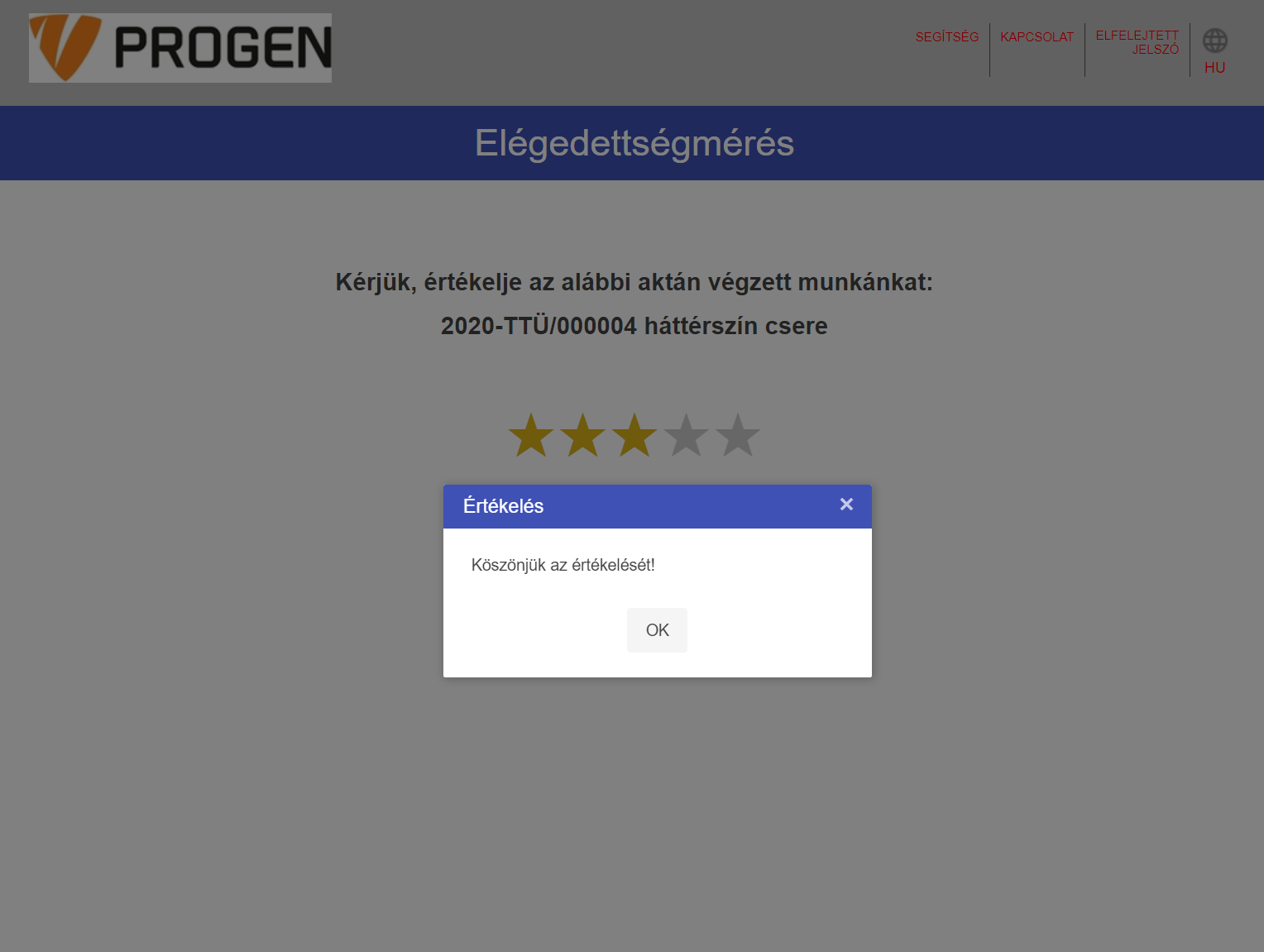 Amennyiben az értékelés megtörtént az értékelő részére „Köszönjük az értékelést!” üzenettel véget ér a folyamat.