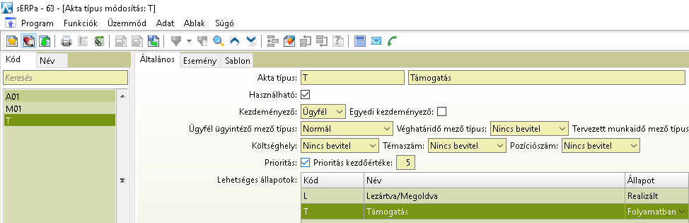 2. Az akta típus funkcióban adjuk meg, hogy az új aktáknak mi legyen a kezdő prioritása.
