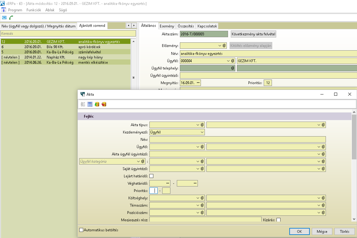 1. Az akta funkcióban az Általános fülön tudjuk módosítani az akta prioritását, vagy ha üresen hagyjuk akkor kivenni a prioritásos akták közül.