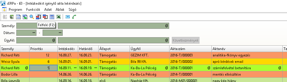 4. Az Intézkedést igénylő akta lekérdezés és az Akta funkcióban az eredményképernyőn is megjelenítésre kerül az akta prioritása, valamint itt a F2/F3/+/- gombokkal léptetni tudjuk a prioritást a funkcióban leírt szabály szerint.(F2/F3 esetén nem egyesével történik a léptetés, a +/- gombbal lehet egyesével léptetni, és nem kerül naplózásra és üzenet se kerül kiküldésre, itt lehet tömegesen átsorolni csoportokba)