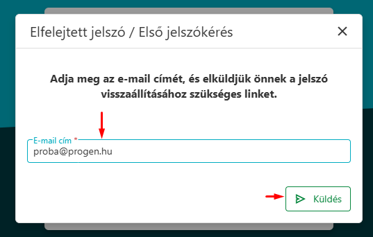A link megnyomásakor egy felugró ablakban adhatjuk meg az emailcímet, ahová az email érkezik az információkkal és a jelszó módosításához szükséges linkkel.