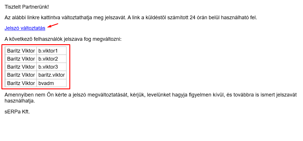 Az emailben jelezi a rendszer, hogy mely felhasználók jelszava fog megváltozni (minden olyan felhasználó, ami az adott személyhez köthető)