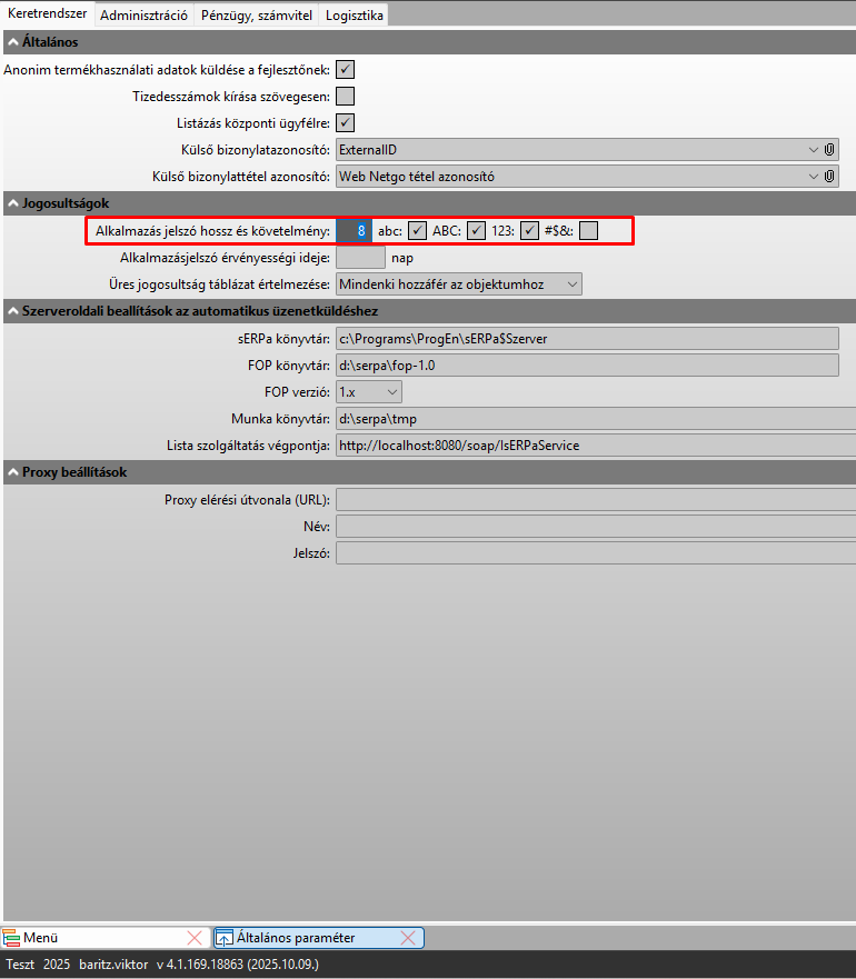 FONTOS! A jelszó követelményeket a sERPában az Általános paraméter bevitelben kell megadni.