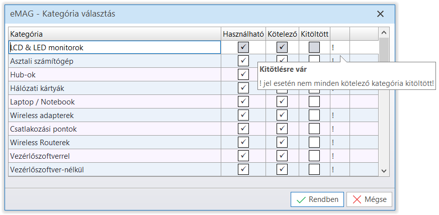 Kitöltésre vár - A Kategórián (eMAG - Category) belül vannak kötelezően kitöltendő karakterisztikák (Termékkategóriák), melyekhez kötelező legalább egy értéket (Termékkategória tételt) megadni.
