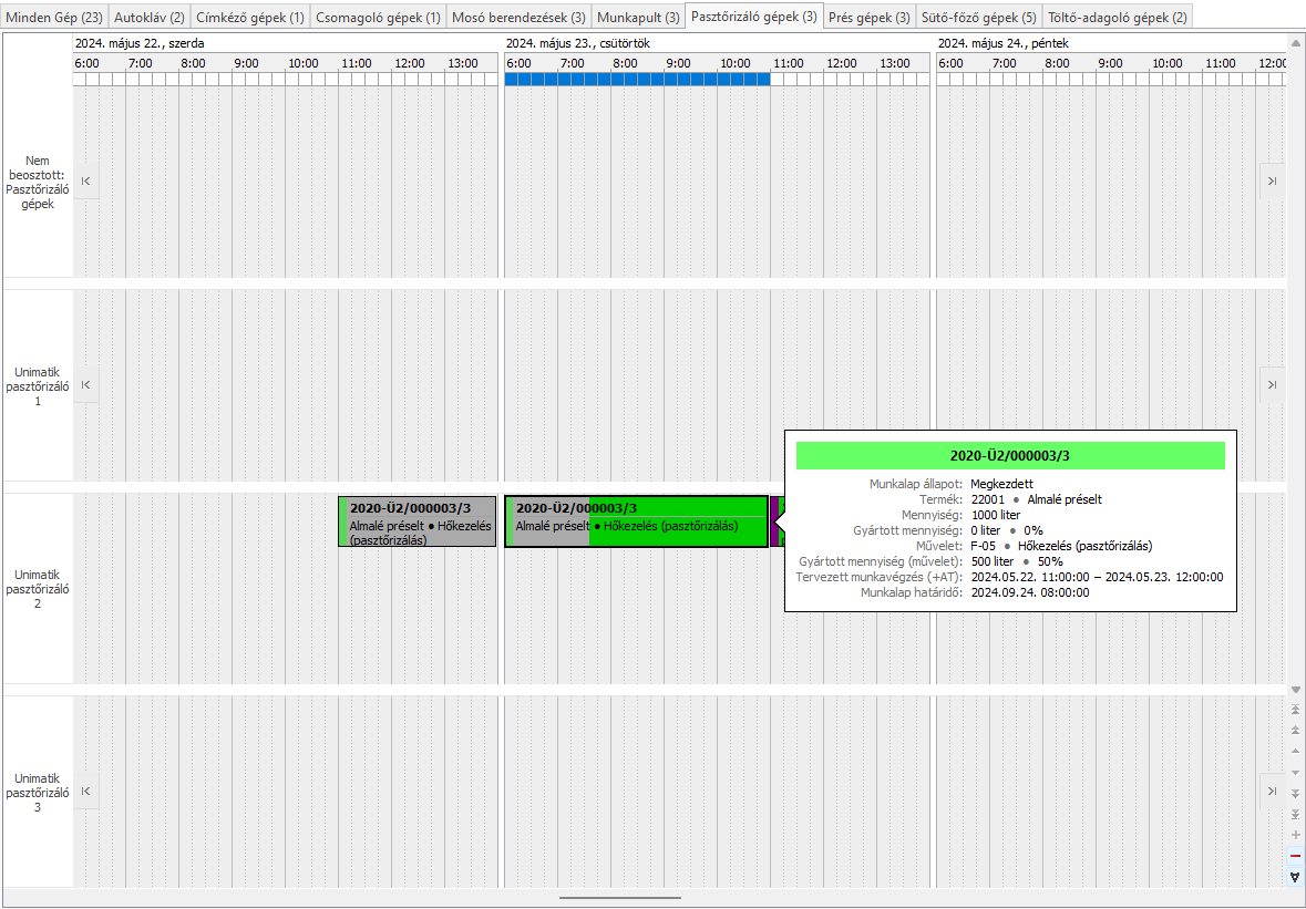 Az ütemezési területen megjelenítésre kerülő feladatoknál megállapítható a feladat dobozra ránézve a készültség. A készültség mértékének megfelelően szürke csík látható a dobozon. A feladat fölé húzva az egeret a felugró szövegbuborékban a művelet készültsége százalékos kiírásban is látható. A művelet készültsége a dobozban százalékos formában látható.