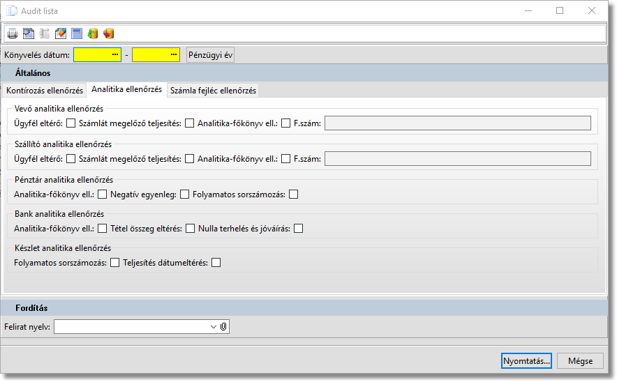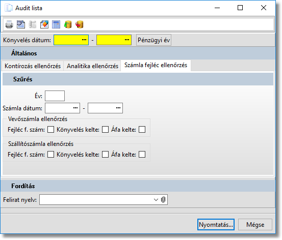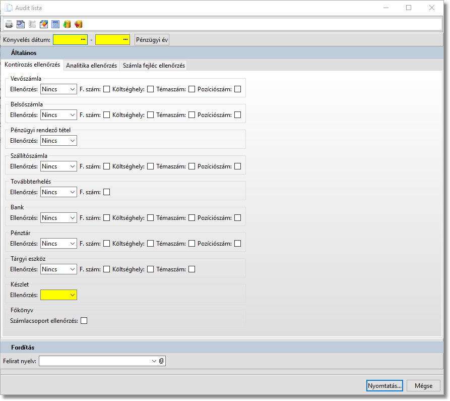 Funkció elérése menüszerkesztéskor: Főkönyv / Listák / Audit