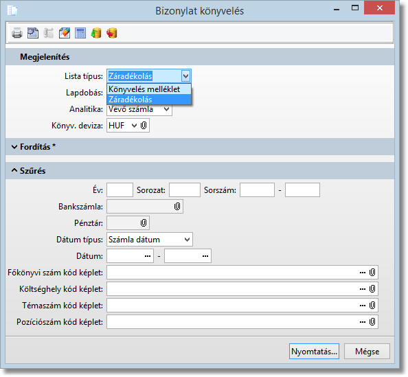 A listával a bizonylatok alapján történt könyvelések listázhatók. Nyomtatható bizonylatonként, így a bizonylat mögé fűzhető. Ha záradékolás típusú listát nyomtatunk, akkor a témaszámban felvett záradék szövegeket nyomtatja a program.