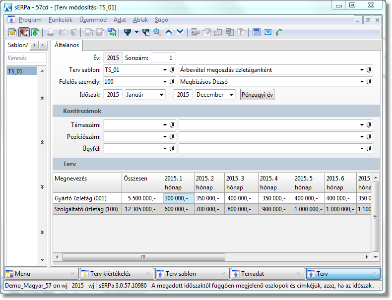 2. Végezzük el a tervadatok felvételét a Terv funkcióban a Terv sablon alapján megjelenő táblázatban.