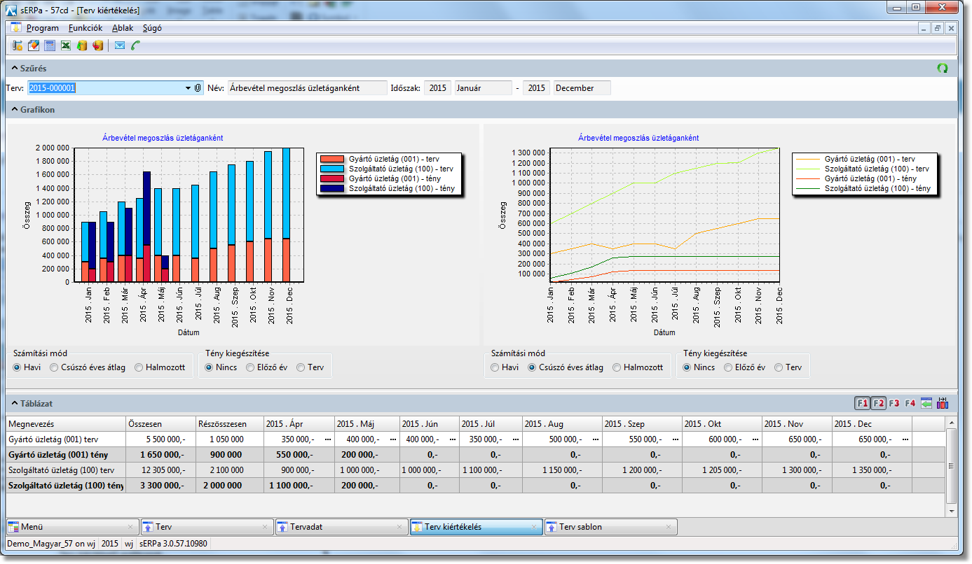 4. A Terv kiértékelés funkcióban grafikusan és táblázatosan is megjelennek a kívánt időbontásban a kiválasztott terv kiértékelését szolgáló adatok. Itt különböző szempontok szerint végezhetjük az elemzést. A grafikonok megjelenítését a havi bontáson kívül kérhetjük Csúszó éves átlag, vagy Halmozott módon. A tényadatokat kiegészíthetjük az Előző év, vagy a Terv adataival. A táblázatban megnézhetjük a Terv, tény, Eltérés, Eltérés % időszaki számadatokat. Részösszesent képezhetünk, valamint a tervbeli időszakon belül tovább szűkíthetjük a megjelenő adatokat, ha csak szűkített időtartományt szeretnénk vizsgálni.