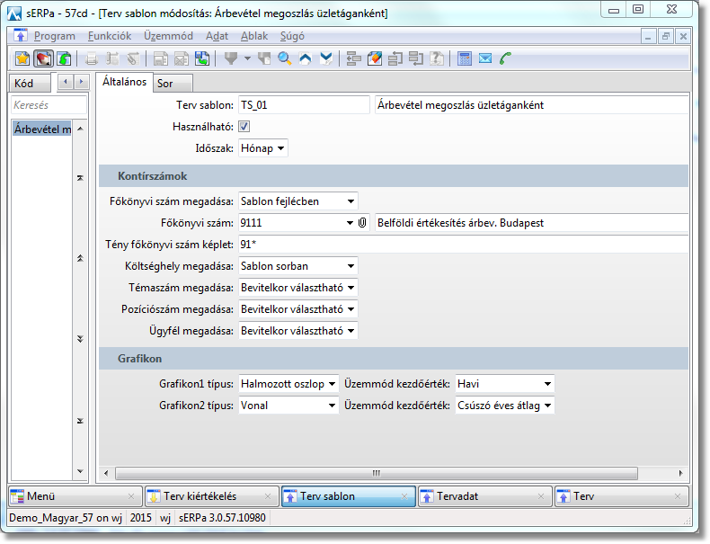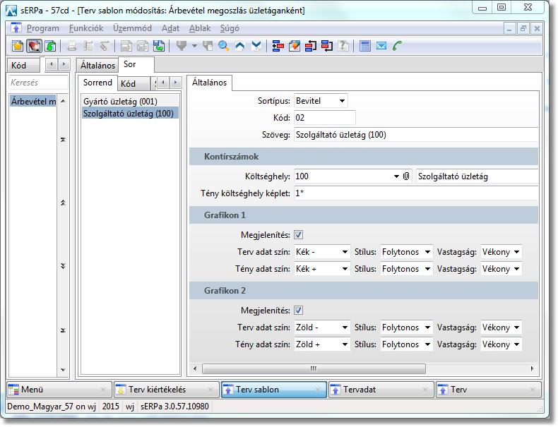 1. A Terv sablon funkcióban határozzuk meg, hogy milyen időszakra és a főkönyv mely dimenzióira szeretnénk felvenni a tervadatokat. Itt nevesítjük a tervsorokat és definiáljuk, hogy a terv kiértékelésekor milyen grafikonon szeretnénk a terv és a tény adatokat megjeleníteni. A Sor fülön a Sortípus mezőben a Bevitel típuson kívül - ami azt jelenti, hogy a Terv funkcióban meg fogjuk adni időszakonként a konkrét tervszámokat - egyrészt lehetőségünk van Összesen típust is választani, aminek a segítségével egy terven belül összesen sorokat is tudunk képezni és megjeleníteni, másrészt Hivatkozást is használhatunk más tervsablon soraira. Ezzel lehetőségünk van arra, hogy például az üzletági árbevételterveket konkrétan definiáljuk, de a céges árbevételtervbe csak meghivatkozzuk az üzletági tervsorokat, így azokat nem kell ismételten rögzíteni.