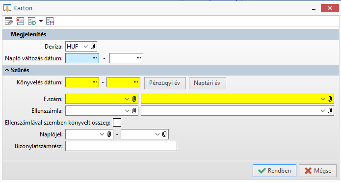 Funkció elérése menüszerkesztéskor: Főkönyv / Karton lekérdezés