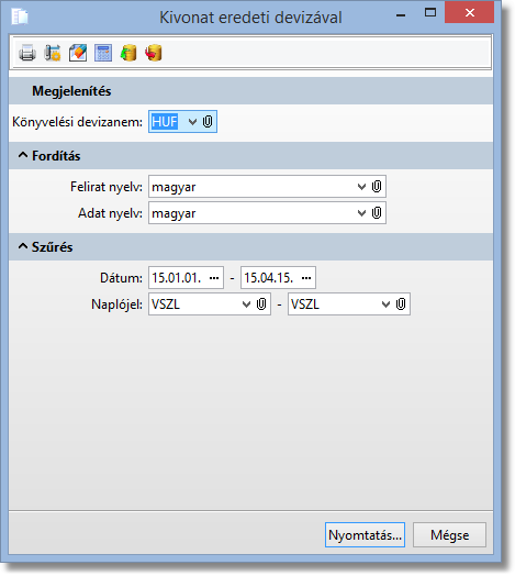 Funkció elérése menüszerkesztéskor: Főkönyv / Listák / Kivonat eredeti devizával