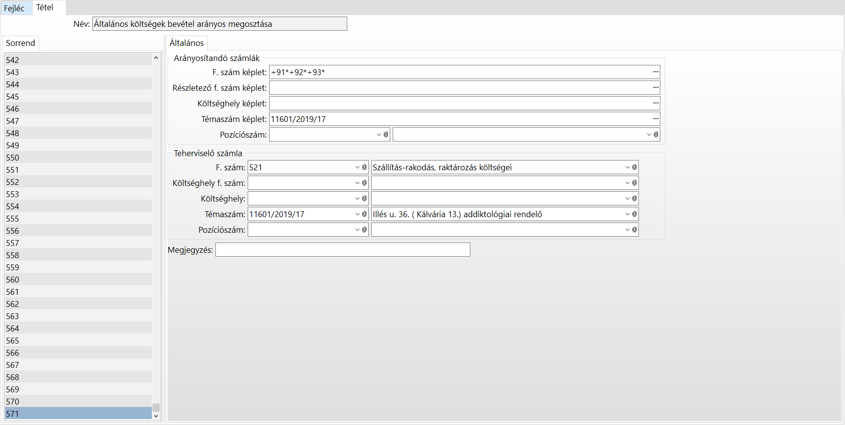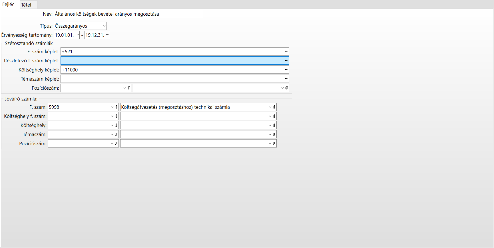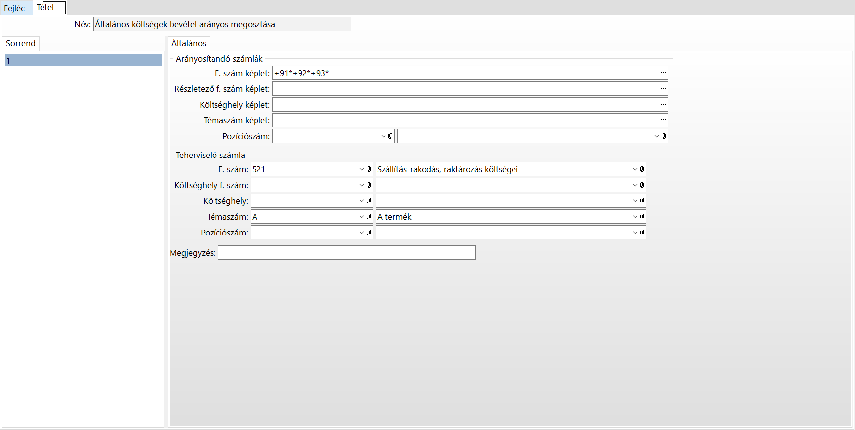 1.1. Szétosztandó számlák között határozzuk meg azokat a költségnemeket, amelyekre felosztható költséghelyen történt könyvelés az időszakban. F.szám képletbe adjuk meg a költségnemet (pl. 521 - Rakodási költségek), illetve a Költséghelybe azokat a költséghelyet (pl. 1000 - Általános felosztható költségek)