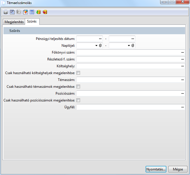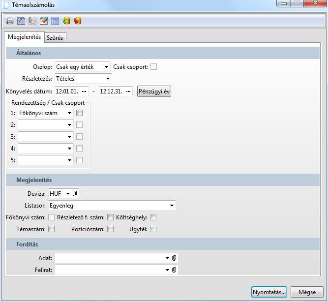 Funkció elérése menüszerkesztéskor: Főkönyv / Listák / Témaelszámolás