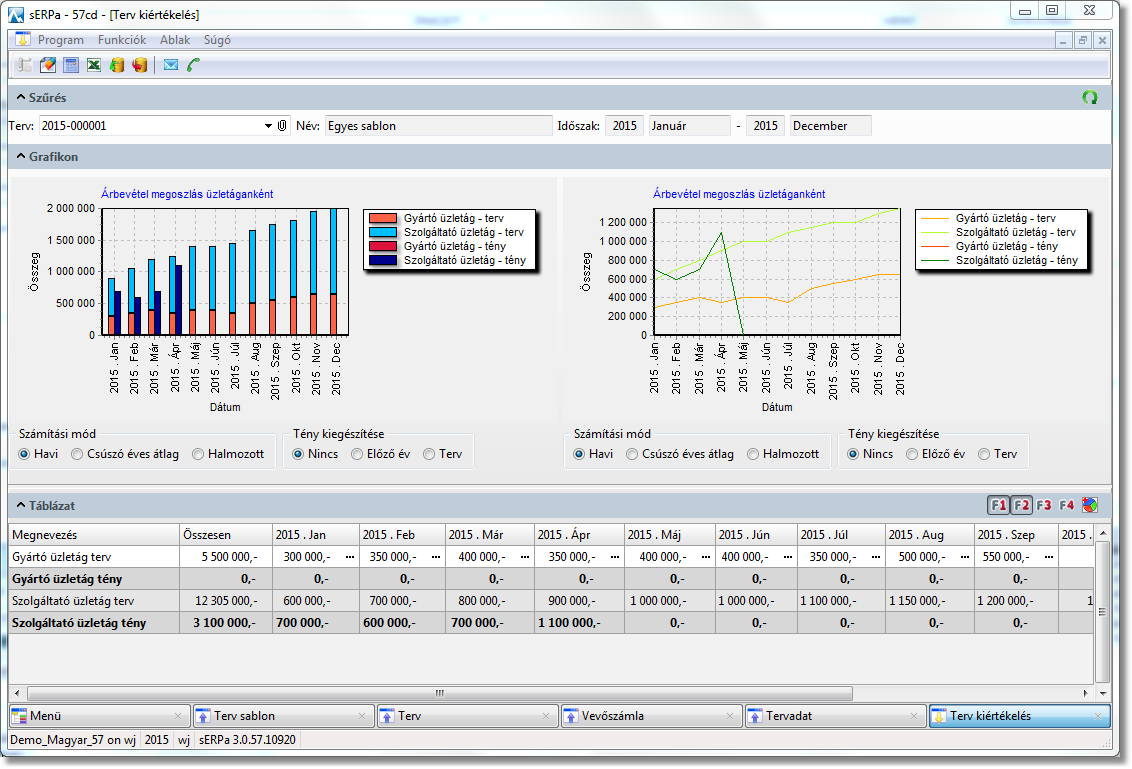 Lehetőség van a tervsorok eltüntetésére / megjelenítésére - F1, a vastaggal kiemelt ténysorok eltüntetésére / megjelenítésére - F2, a terv/tény eltérés összeg sorának megjelenítésére (Tény-Terv) - F3 és a a terv/tény eltérés százalék (%) sorának megjelenítésére (100*(Tény-Terv)/Terv) - F4 is. Ezen kívül a táblázatban megjelenő oszlopokat szűkíthetjük a fenti időszakon belül egy kisebb időszak tartományra. Továbbá kitehetünk egy részösszesen oszlopot is egy szintén megadható időszak tartományra vonatkozóan. A táblázat sorainak megnevezései szintén a sablon sorokban megadott nevekből ered, mint a grafikon jelmagyarázata. A táblázat sorok és oszlopok megjelenítésének gombokkal való módosításai a grafikonra nincsenek hatással.
