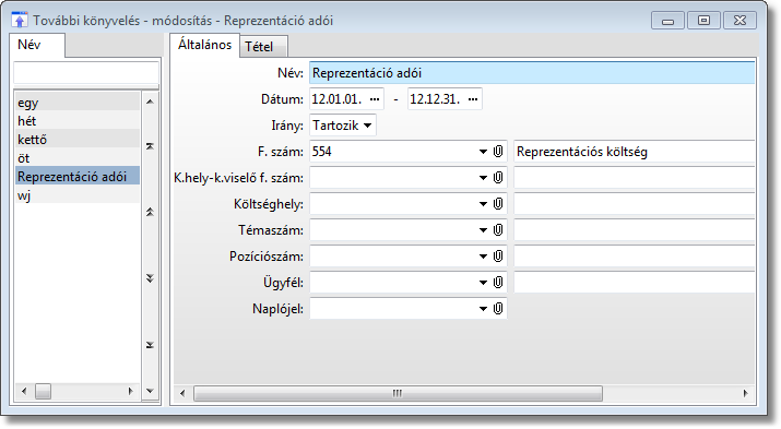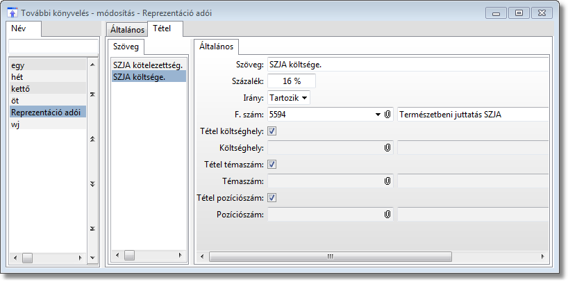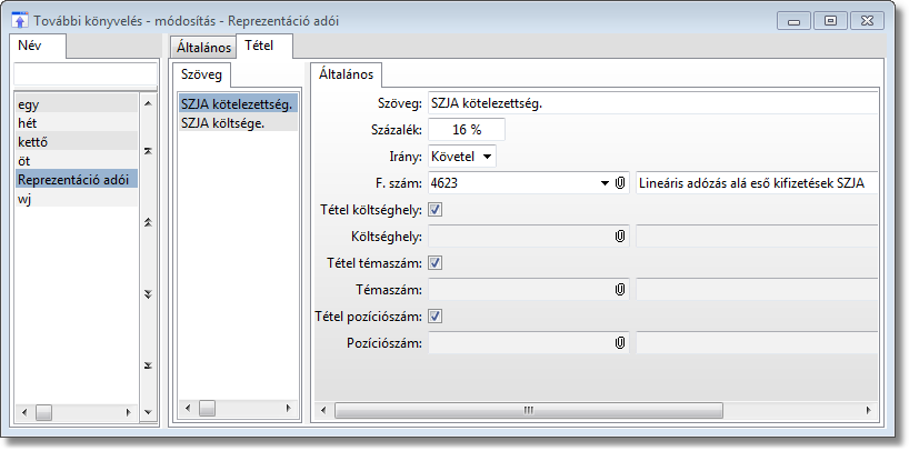 Ha például az a célunk, hogy minden reprezentációra könyvelt összeghez automatikusan lekönyvelődjön az azt terhelő SZJA is, akkor az általános fül F.szám mezőjébe írjuk be a reprezentáció főkönyvi számot.