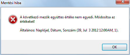 A naplójelen és dátumon belüli sorszáma a könyvelésnek automatikusan megajánlásra kerül. Az érték ajánlás (Ctrl+A) funkció elindításával az adatbázisból a soron következő értéket jeleníti meg. Erre főleg akkor van szükség, ha többen könyvelnek egyszerre ugyan abban a naplóban ugyan arra a napra, mert ekkor a rögzítés kezdetekor mindketten ugyan azt a könyvelési számot kapják meg az általános fülön a sorszám mezőben, azonban amikor az egyik felhasználó elmenti a könyvelését, a másik már nem tudja ugyan azzal a számmal elmenteni az övét, ezért megjelenik az alábbi hibaüzenet: , amely leOKézása után a kurzor a sorszám mezőn áll. Ekkor kell használni az érték ajánlás funkciót (Ctrl+A), amely a soron következő szabad könyvelési számot írja be a sorszám mezőbe. Ezután lehet a rögzítés (Ctrl+R) ikonnal elmenteni a könyvelést. |
