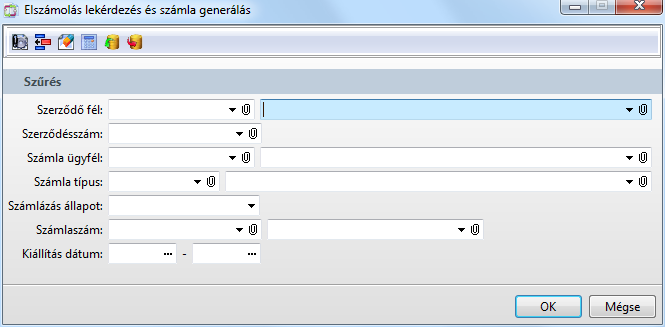 A párbeszédablakban megadott szűrési feltételeknek megfelelő elszámolás tételek lekérdezése. Az eredményhalmazban megjelenő tételeket művelettel kiszámlázhatjuk, kiszámlázott tételekhez mellékletet nyomtathatunk vagy, amennyiben a kiszámlázott tételekhez tartozó számla stornózott, akkor azokat stornózhatjuk.