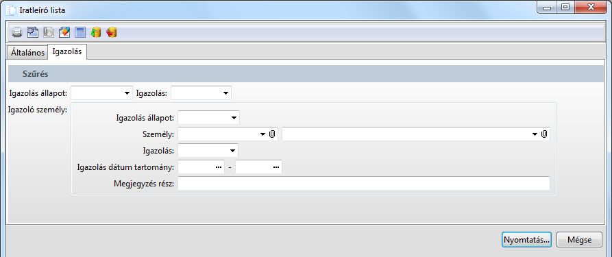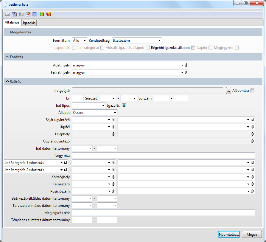 A funkcióval listázhatjuk az iratok adatait, különböző szűrések állíthatók be, valamint megadható a rendezettség és a részletezés. Ezzel a listával azokat az adatokat listázzuk, amelyeket a sERPában vettünk fel az irat bevitelben. Ha az iratban szereplő képet (pl. az eredeti irat szkennelt képét) szeretnénk kinyomtatni, ezt úgy tehetjük meg, hogy az irat oldalon állva indítjuk el a nyomtatást.