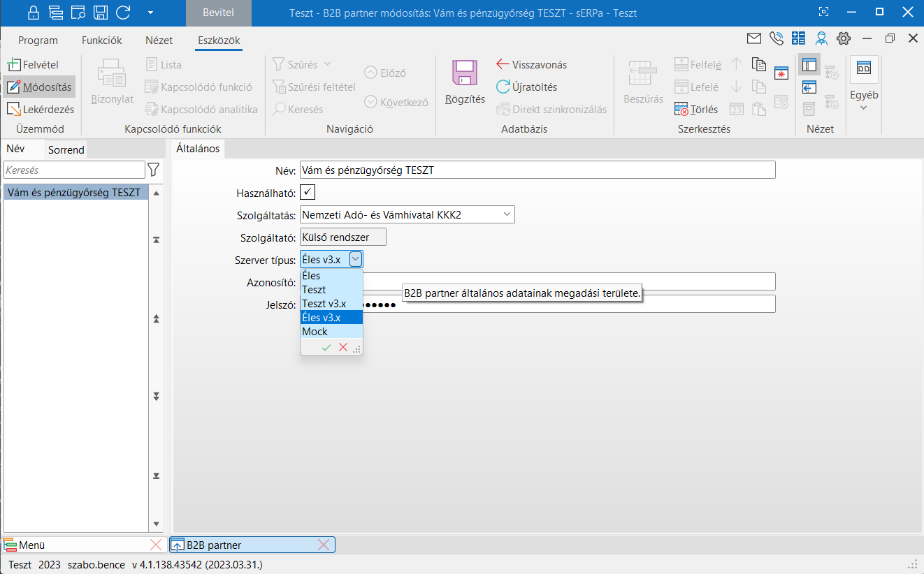 3.2023.02.13-tól történt változás miatt a 136os verziótól az Éles v3.x szerver típust kell választani éles verzió esetén, Teszt esetén pedig a Tesztv3.x szerver típus a használandó. (Mock típust nem kell figyelembe venni)