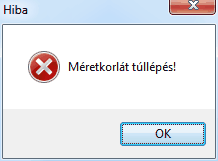 A termék funkcióban lehet lekorlátozni a menteni kívánt kép maximális méretét Kb-ban megadva. Túlméretes kép esetén az alábbi Méretkorlát túllépés! hibaüzenetet kapjuk a programtól. A terméken belül az egyes képek nem lehetnek nagyobbak az itt megadottnál.