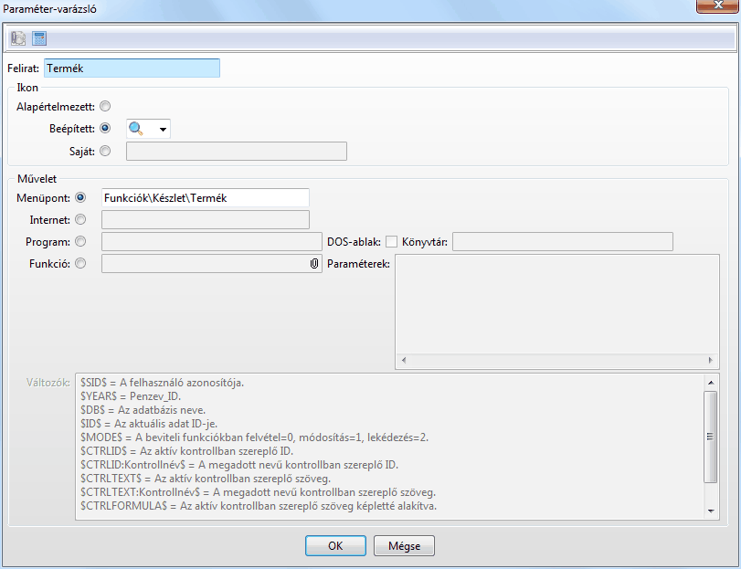 Az Ikonleíró lehet egy sorszám, amivel a programba beépített gyorsgombok közül lehet választani.